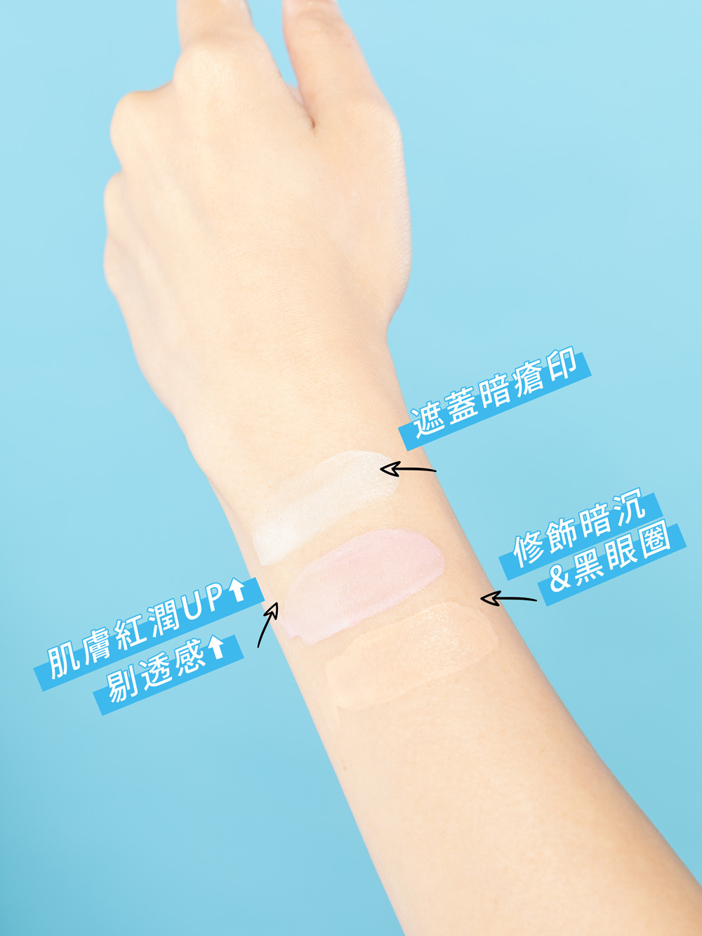 白色:專門打造肌膚膚質或水潤感,適合任何膚色 粉紫色:適合偏白、血色不足的人士,專門提升肌膚紅潤和剔透感 珊瑚色:特別針對血液循環不佳而導致藍調的暗沉和黑眼圈 奶黃色:改善膚色不均暗沉位置,自然提亮功效十足 綠色:容易敏感泛紅肌膚就最適合不過! |