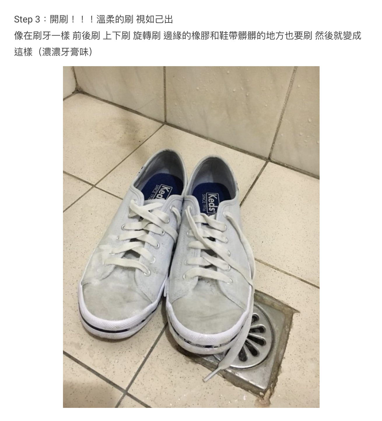 步驟3: 溫柔地擦拭鞋面,包括橡膠邊緣及鞋帶,鞋子充滿濃濃牙膏味是正常現象