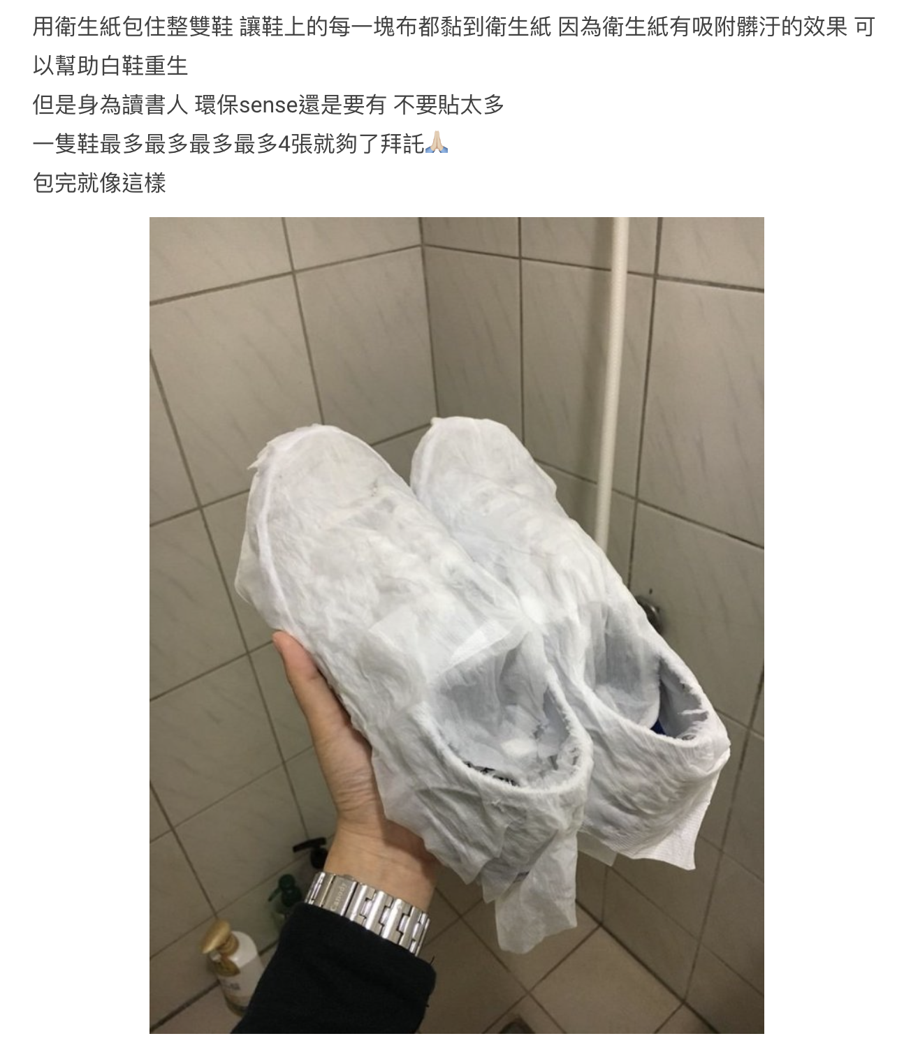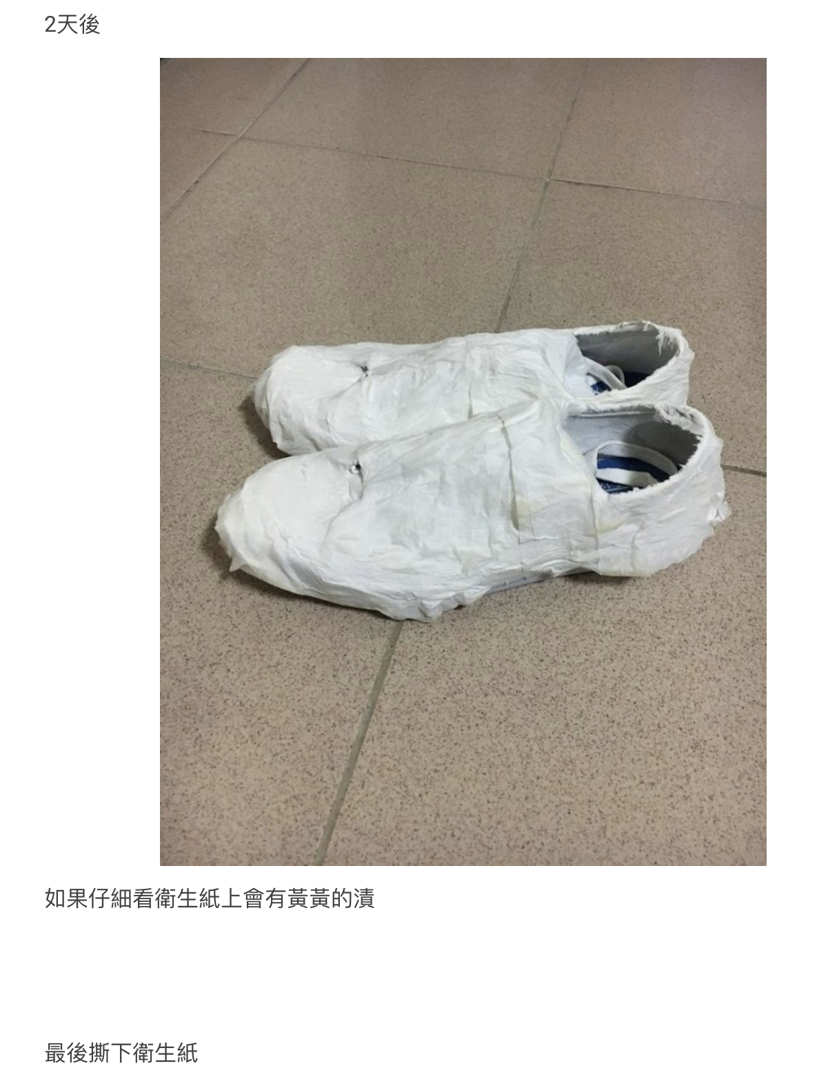 步驟5: 將紙巾包住鞋子,讓鞋子全方位都黏到衛生紙,幫助吸附髒汙,令白鞋變白。(在紙巾上戳出幾個小洞,好令紙巾更通風)