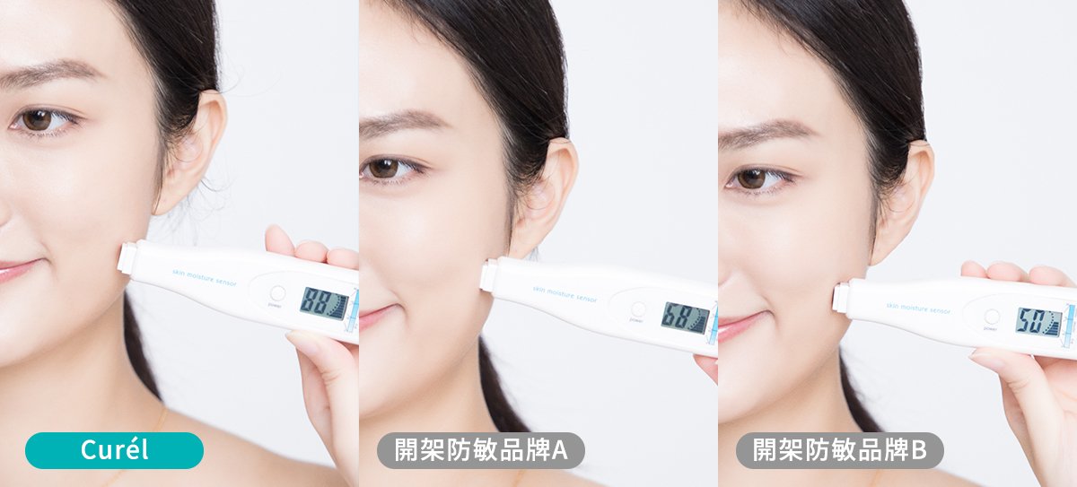 (圖左:Curél;圖中:開架防敏品牌A;圖右:開架防敏品牌B) 比拼二:保濕度 Curél 保濕度完勝! Curél 潤浸保濕修護面膜保濕能力完勝其他防敏品牌!10 分鐘後把面膜拿下,小編看到皮膚發出前所未有的光澤,而且嘴角,眼簾,鼻翼的脫皮情況亦通通消失,十分驚喜! |