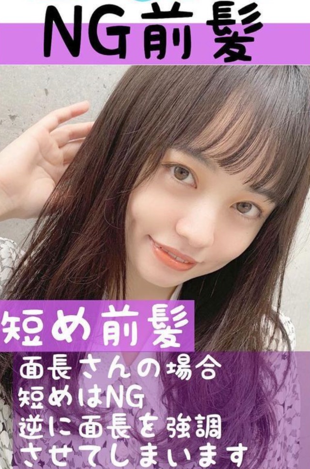瀏海要比眉毛位置長一點,遮蓋著眉骨位置。同時不要剪太過整齊貼服,適當的透明感才有減少臉長效果。