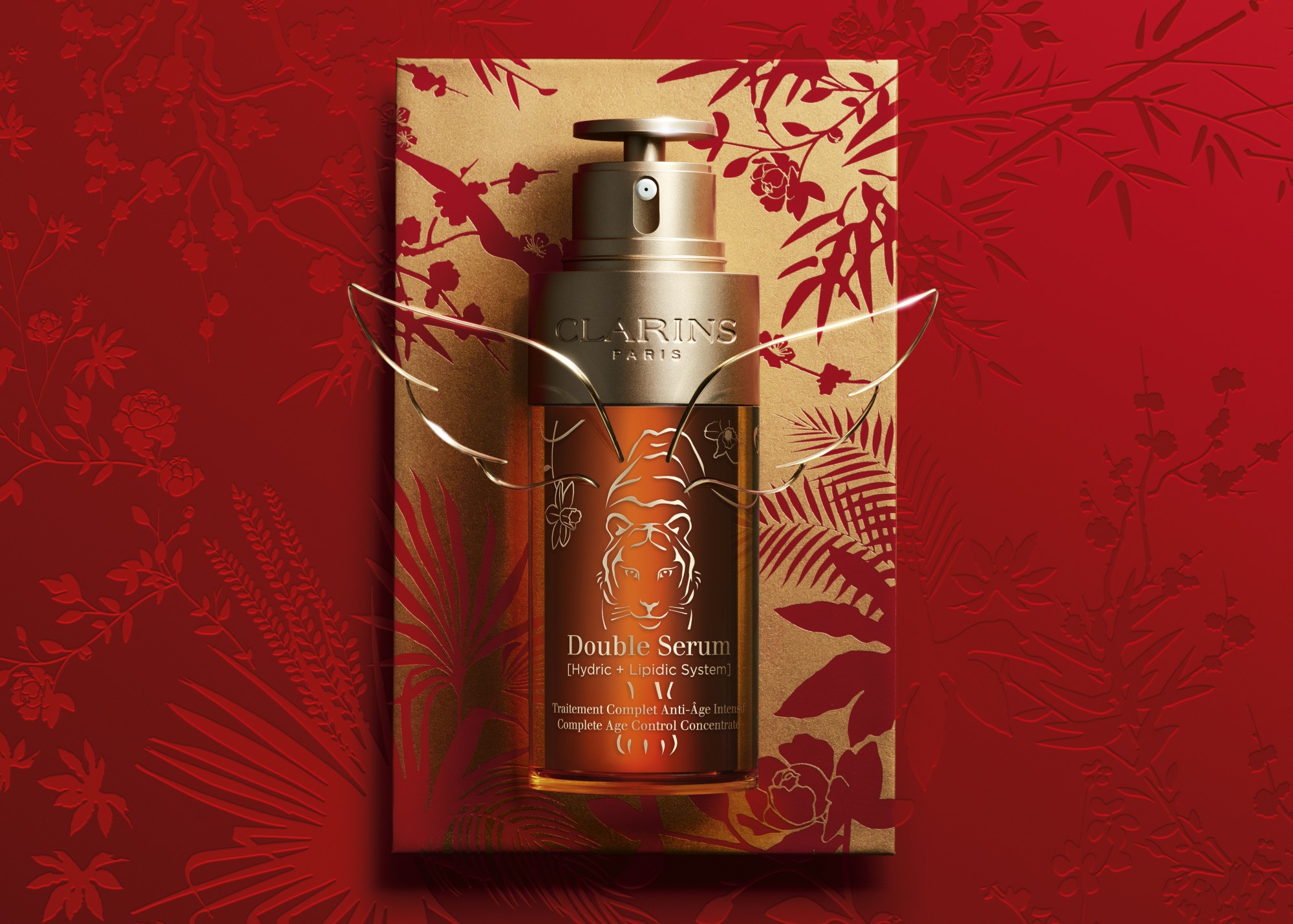 CLARINS皇牌產品賦活雙精華換產虎形及年花線條,寓意2022年虎虎生風,令肌膚萬象更新。以2:1親膚黃金比例調配出「水+油」雙精華配方,21種高效修護抗老植物萃取激發肌膚再生、滋養、保濕、活氧及防禦五大功效,精華直達肌底,雙倍激活年輕,新年就由肌膚開啟新開始!