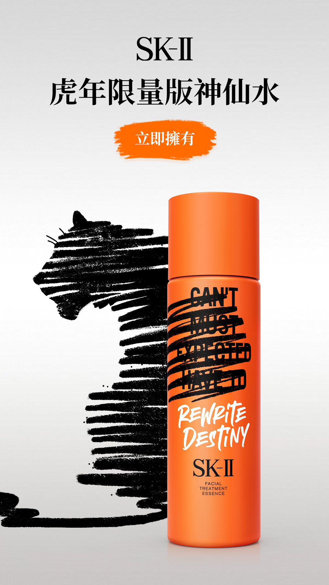 新一年SK-II神仙水換上鮮艷奪目的橙調及虎為靈感,以虎的勇敢、力量和強悍轉化為粗黑線條筆觸,於瓶身寫下不同字詞,鼓勵女性於新一年為命運重新下定義!蘊含PITERA™ 配方的神仙水令肌膚晶瑩彈滑,達到補濕緊緻效果。