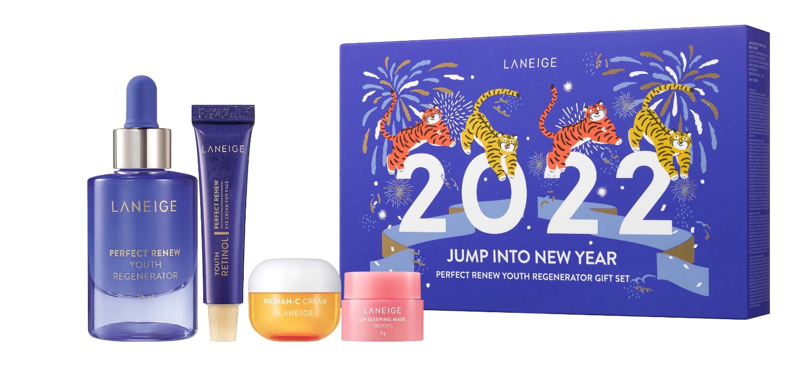 LANEIGE 新一年以萌虎為大家帶來活力朝氣,寓意2022年JUMP INTO NEW YEAR!水活細胞再生新年套裝集合水活細胞再生精華25ml、水活細胞再生重點抗皺霜(#眼紋擦) 10ml、Radian-C™抗藍光淡斑面霜10ml、水潤修護睡眠唇膜3g,共4件人氣熱賣產品。令肌膚回復緊緻彈滑,撫平8大細紋,回復年輕光滑!