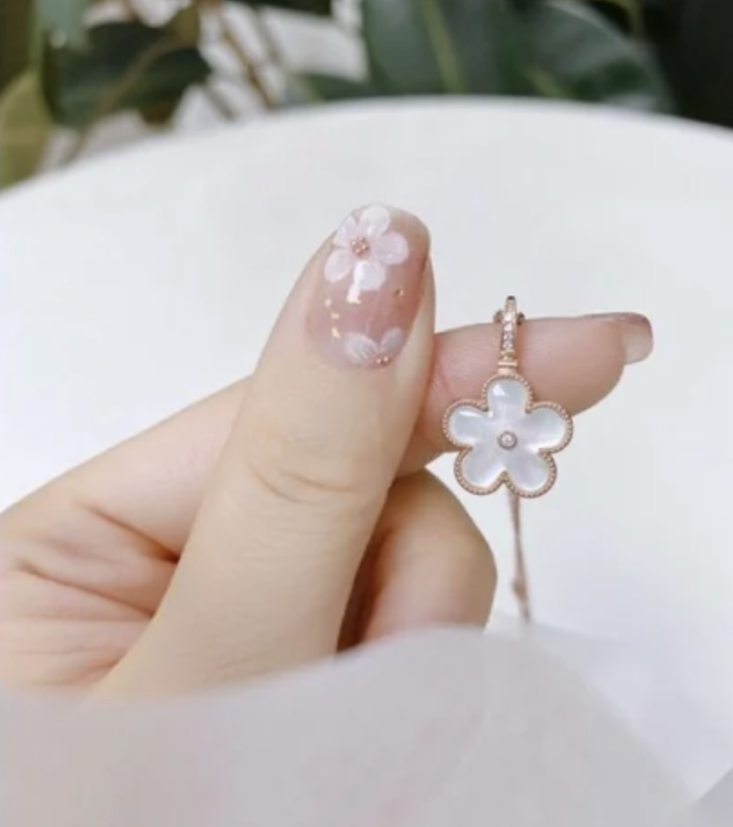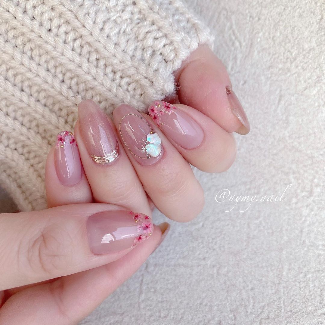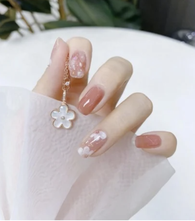 疫情期間未能到日本看櫻花,不妨到指甲上賞櫻,精緻的手繪櫻花綴上小珍珠作花蕊,底色用上粉色漸變,女性優雅魅力十足,充滿心思!