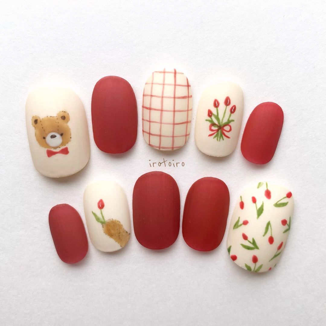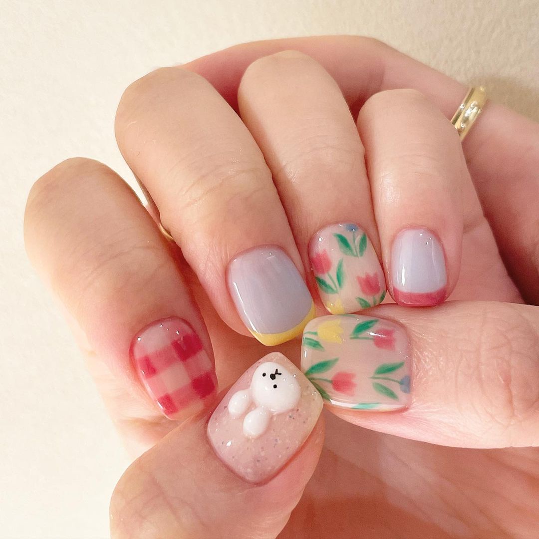 鬱金香代表知性優雅,配合多變畫法能增加日系/可愛感覺,擬真版本的鬱金香結合梅黃色,散發輕熟女氣息!喜歡少女感的可以畫上小熊、小兔,可愛到犯規~