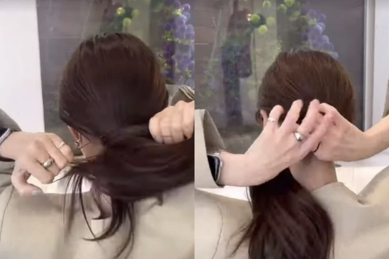 步驟一:先使用橡皮筋隨手綁起低馬尾,再拉鬆頭頂髮絲