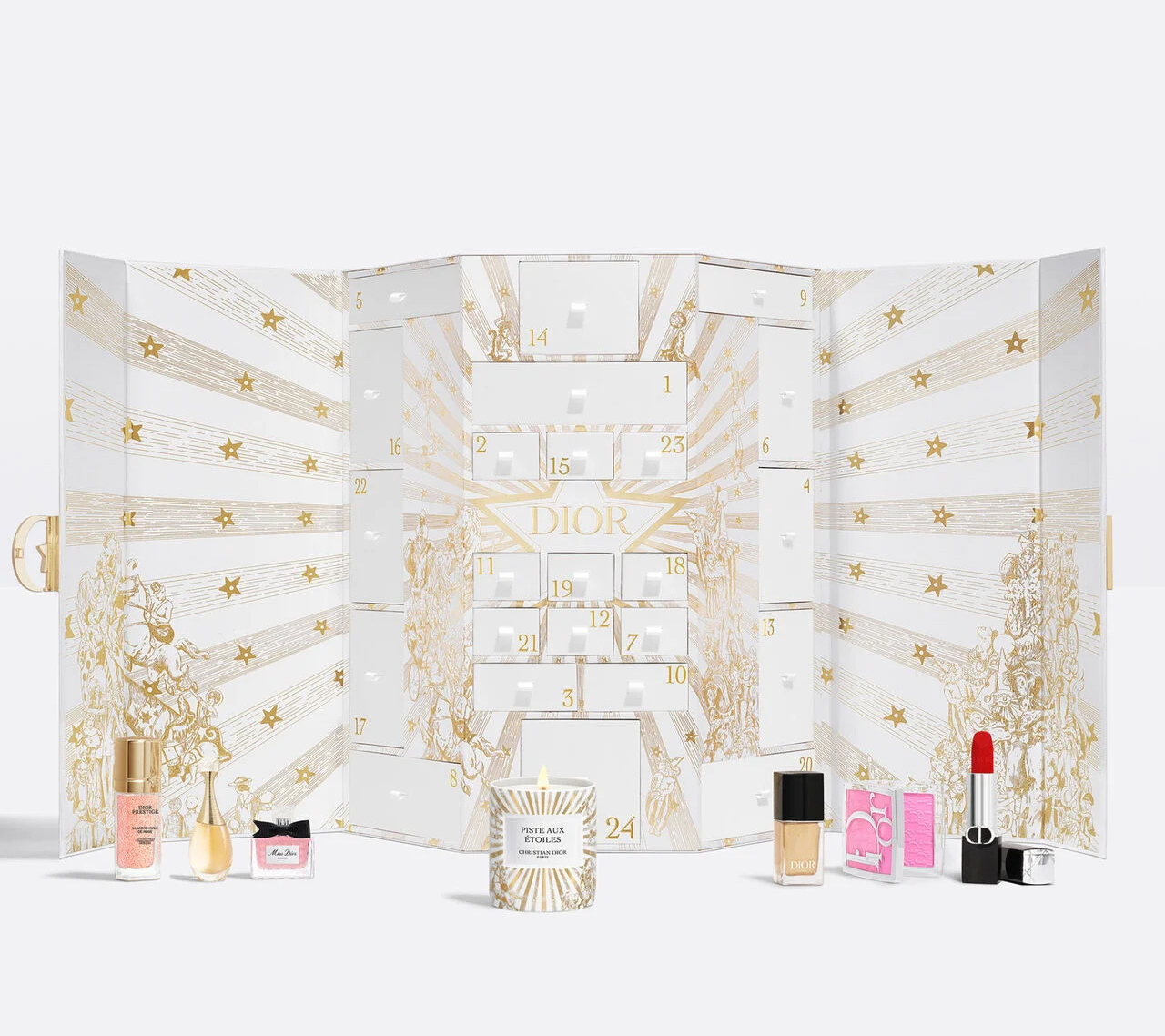 聖誕倒數月曆重現巴黎蒙田大道 30 號經典總店的精緻外觀,內藏24款Dior迷你產品,包括精緻的香薰、優雅別緻的彩妝、護膚產品和香薰蠟燭。