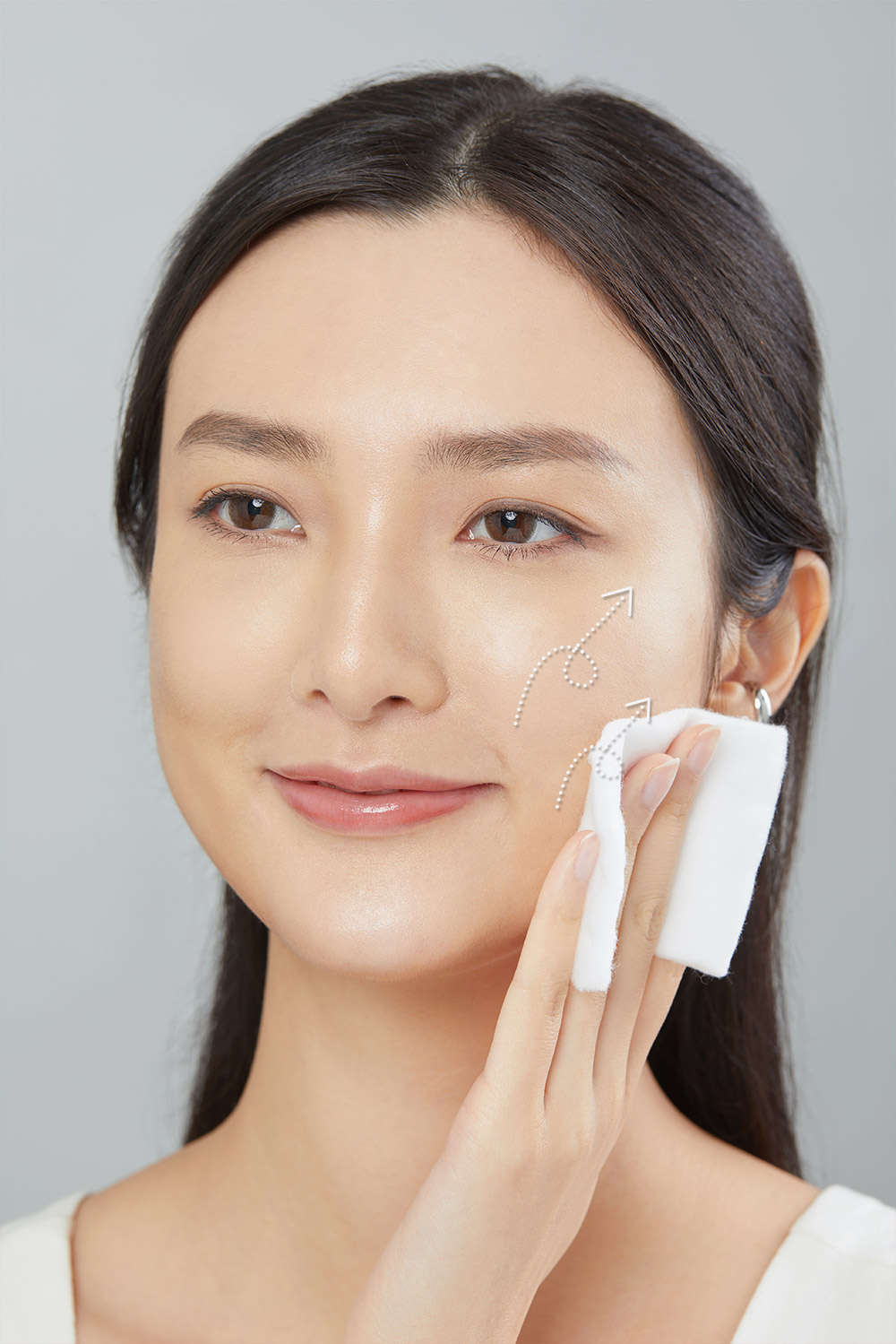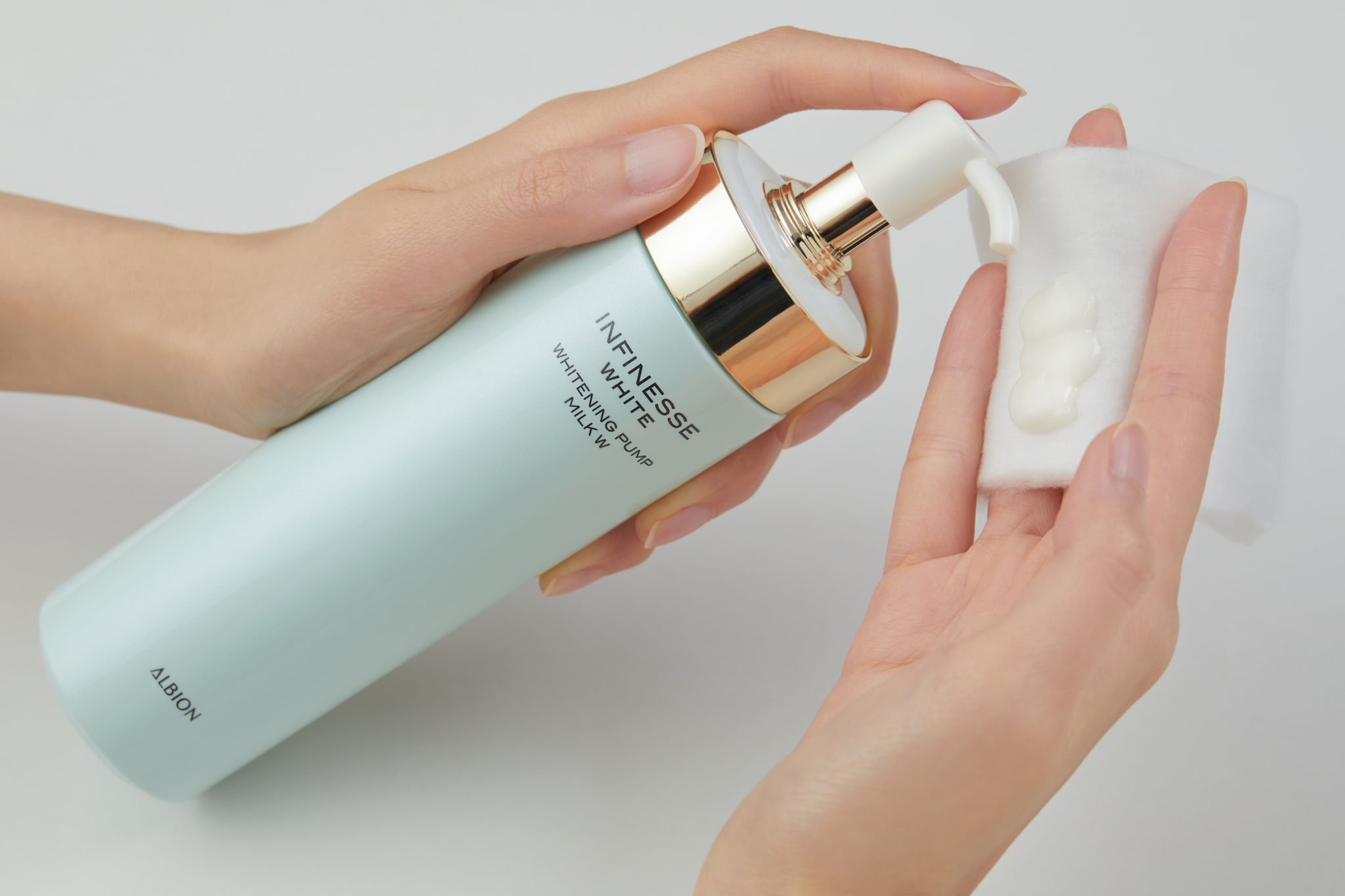 先取3泵平衡滲透乳於ALBION化妝棉,點於額頭、臉頰、鼻子和下巴。配合素肌按摩法,打圈塗勻全面。