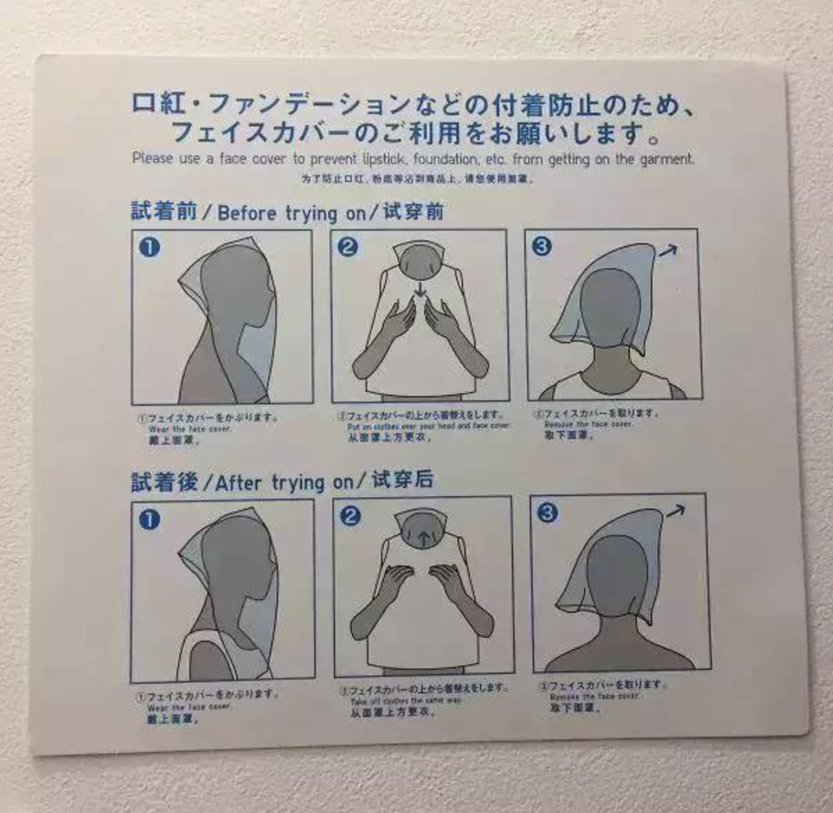 編輯以往在日本也有使用過「安全頭套」,印象中店員會在試衣前解釋用法,亦會在試衣室內貼上告示及使用說明,加上疫情期間保護自己健康,男女生亦有化妝需要,若果在試衣室內看到「安全頭套」不妨要求使用~