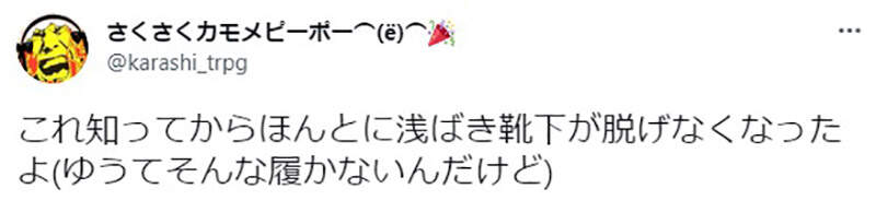 結果她回家後馬上於twitter分享店員傳授的防止襪子滑落冷知識,解釋從相反方向穿著的話令襪子貼合腳跟,就不會容易滑落,結果這項冷知識引起熱烈迴響大爆紅!大部分網友表示自己從未想過從腳跟穿著襪子,自己親身試過後的確變得不容易滑落,同樣認為襪子廠商應該要把這個小秘訣推廣開去,方便更多人使用。