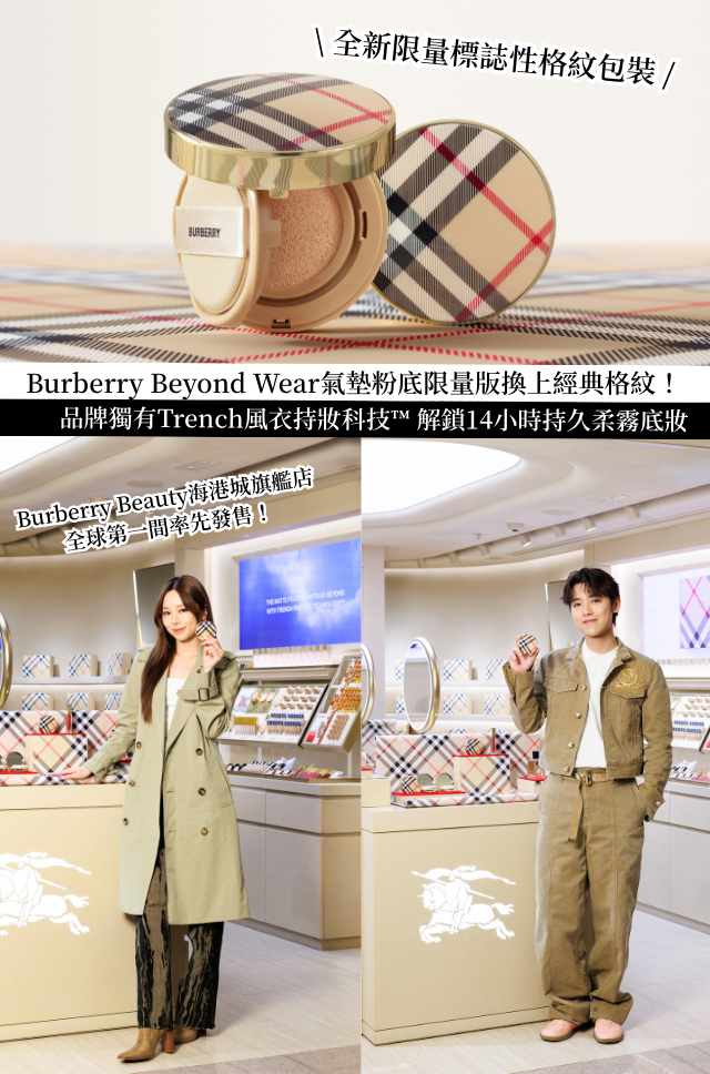 Burberry Beauty今年更特意推出限量版持妝霧柔風衣氣墊粉底,全新限量包裝以Burberry標誌性風衣嘅顛覆性布料為設計靈感,經典格紋再配搭金色框線,不僅在外型上延續低調奢華的英倫風格,還讓底妝像 Burberry 風衣一樣耐看又實用~
