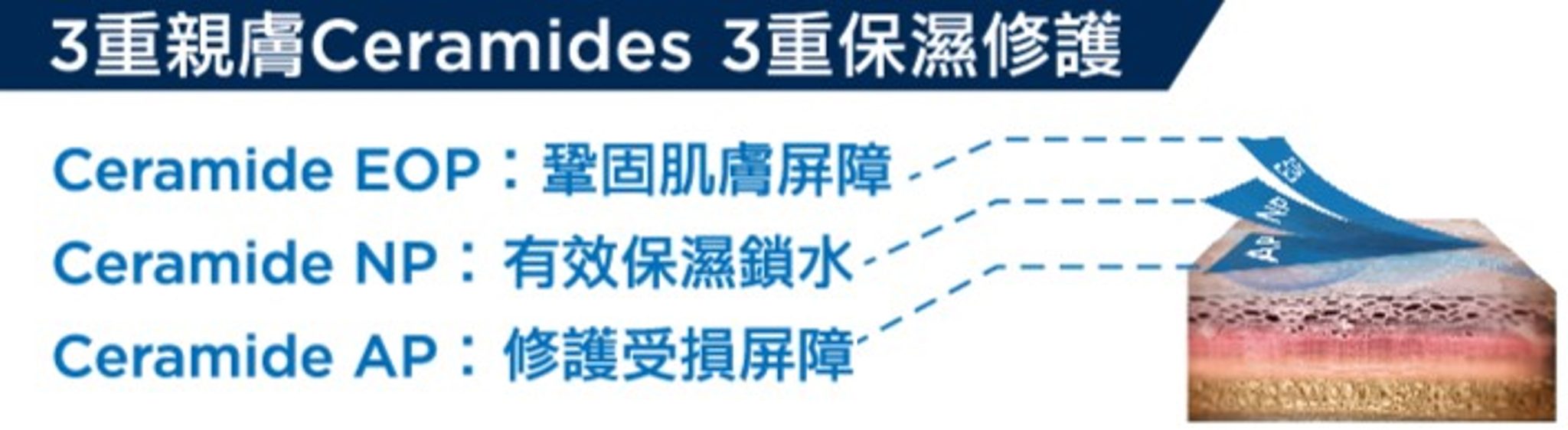 「醫學保濕專家」CeraVe深明Ceramides的重要性,與皮膚科醫生共同研發出各款保濕產品,更在當中特別加入3重親膚Ceramides^ EOP、NP及AP,貼近人體嘅天然Ceramides^,3重保濕修復: Ceramide EOP可以填補肌膚細胞間隙縫,鞏固肌膚屏障;而Ceramide NP則為皮膚表皮築起保護膜,有效鎖水保濕;Ceramide AP的高滲透力就能深入修復乾燥肌膚及受損屏障。