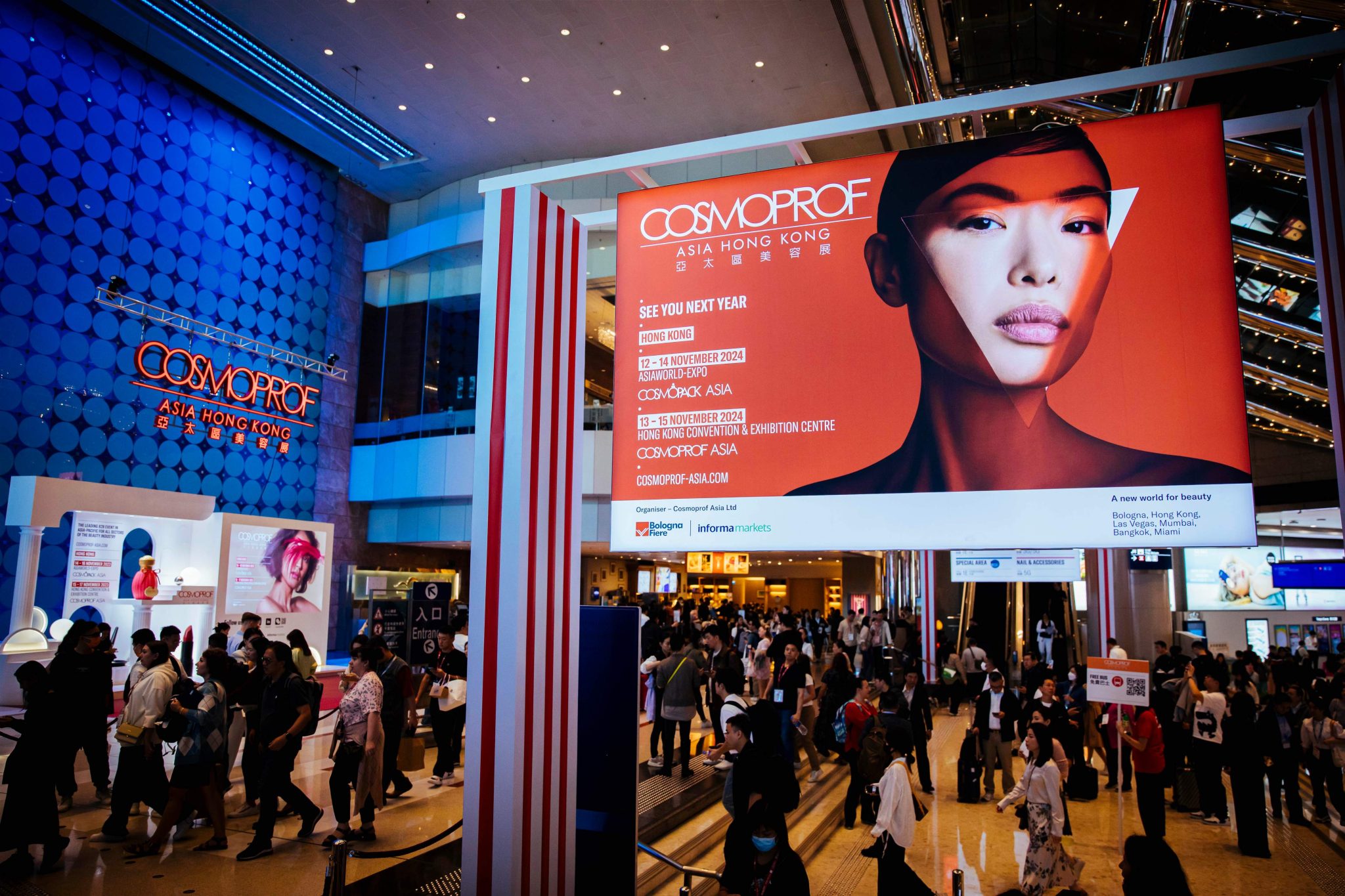 亞太區美容展(Cosmoprof Asia)將專注於美容成品,涵蓋香水、美容院及水療、化妝品、護理產品、美髮、美甲以及天然有機產品。許多知名品牌將在此亮相,參觀者能夠一覽當前市場上最新的產品和趨勢。