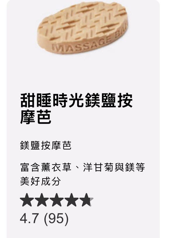 被搶購一空的來自Lush的鎂鹽按摩芭,當中蘊含薰衣草、洋甘菊和鎂元素,用法非常簡單,先用掌心稍微融化按摩芭,或直接以按摩芭輕輕塗抹在肌膚上,就可以幫助放鬆身體,讓你輕鬆入睡。原Post分享更指:「用完這款,我真的秒睡到斷片!睡眠品質超好!」,亦有不少用家指用後的確可以舒緩肌肉痠痛,秒速在網上引起熱潮!