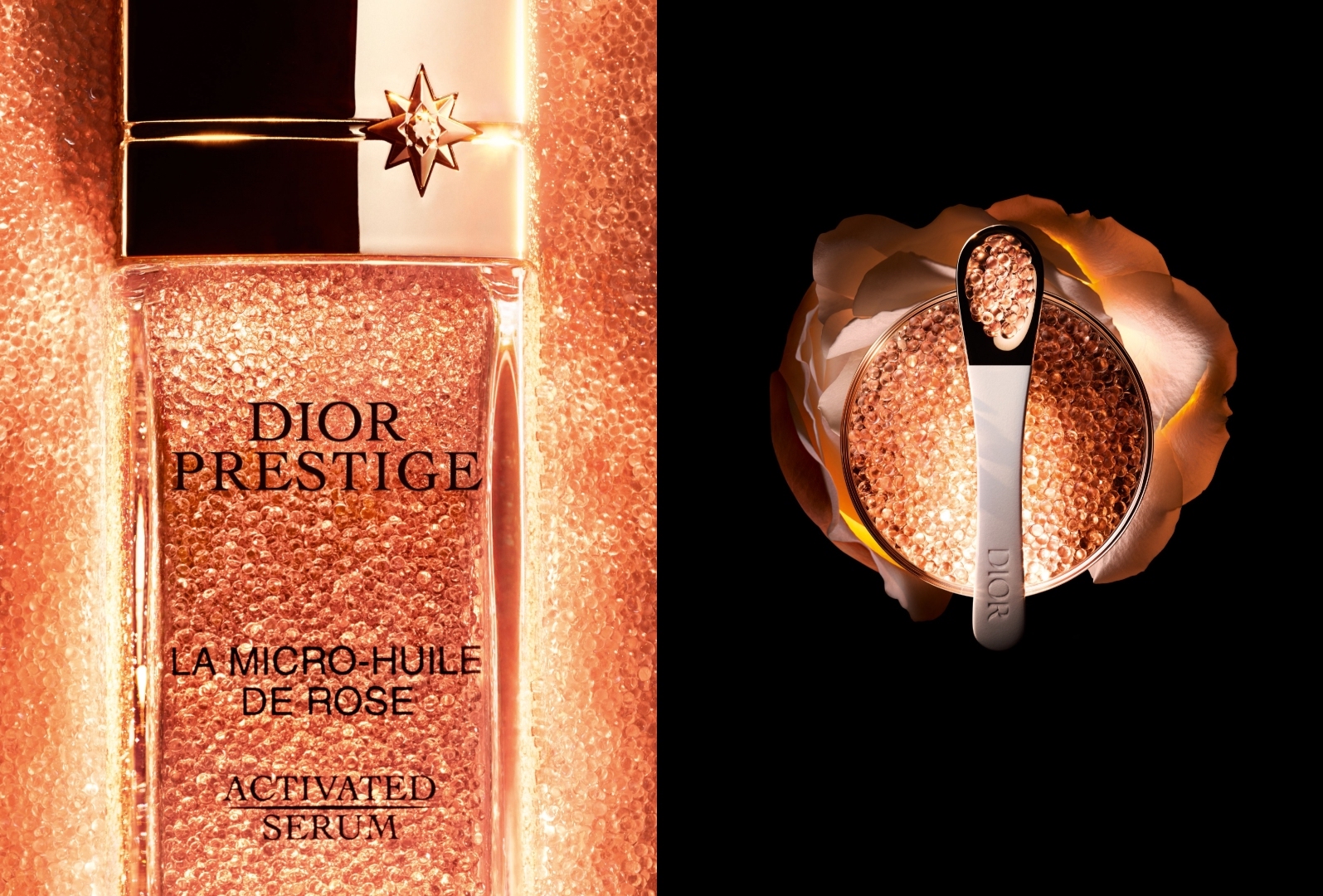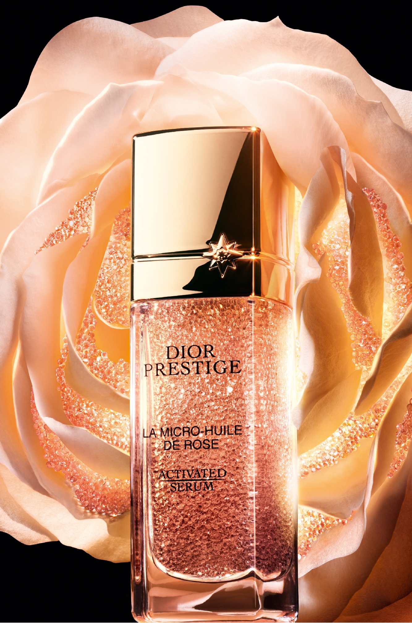 Dior Prestige玫瑰花蜜活養再生精華油中可以見到10,000顆微珍珠粒子,在推開激活後,潤澤的精華瞬間滲透,一塗抺立即被皮膚吸收!除了可以保護肌膚屏障,防止水分流失外,同時提升透明質酸效能,令其發揮即時且持久的完美豐盈效果,更可以在真皮層發揮效能,+40%彈性蛋白,持續使用一個月,視覺年齡立即年輕5歲,回復細緻的少女嫩肌~