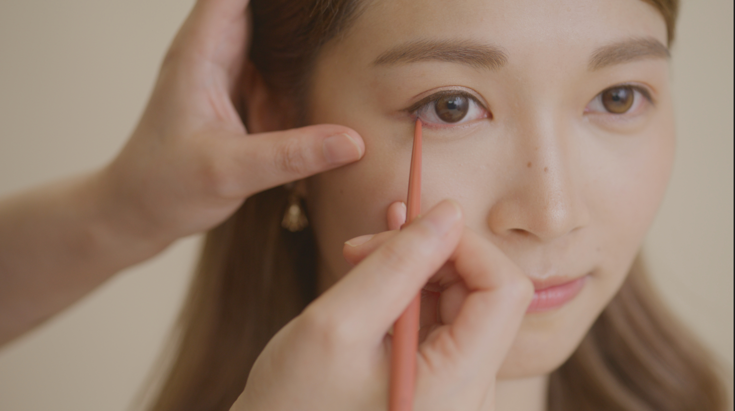 最後以#14粉紅罌粟眼線筆,在下眼尾同前輕輕描繪,打造出陰影效果,放大眼睛,同時增添溫柔可愛感,日系透明感眼妝就完成,秒速擁有深邃動人眼神!