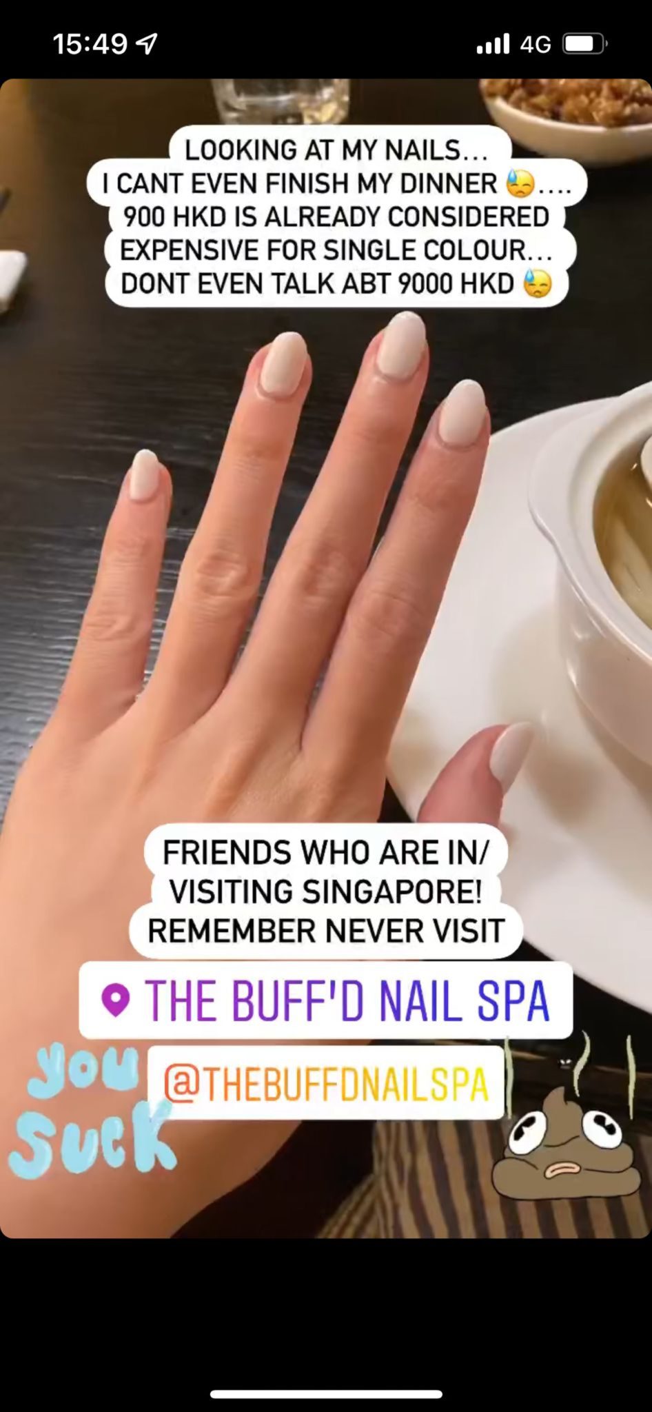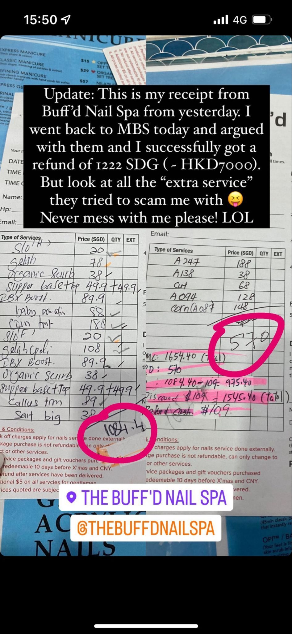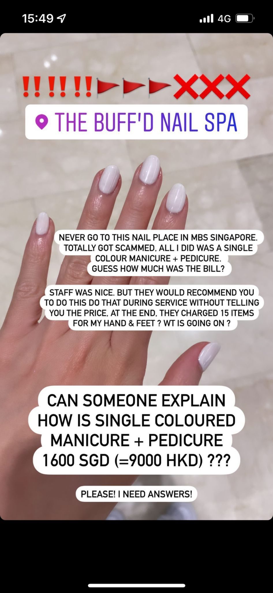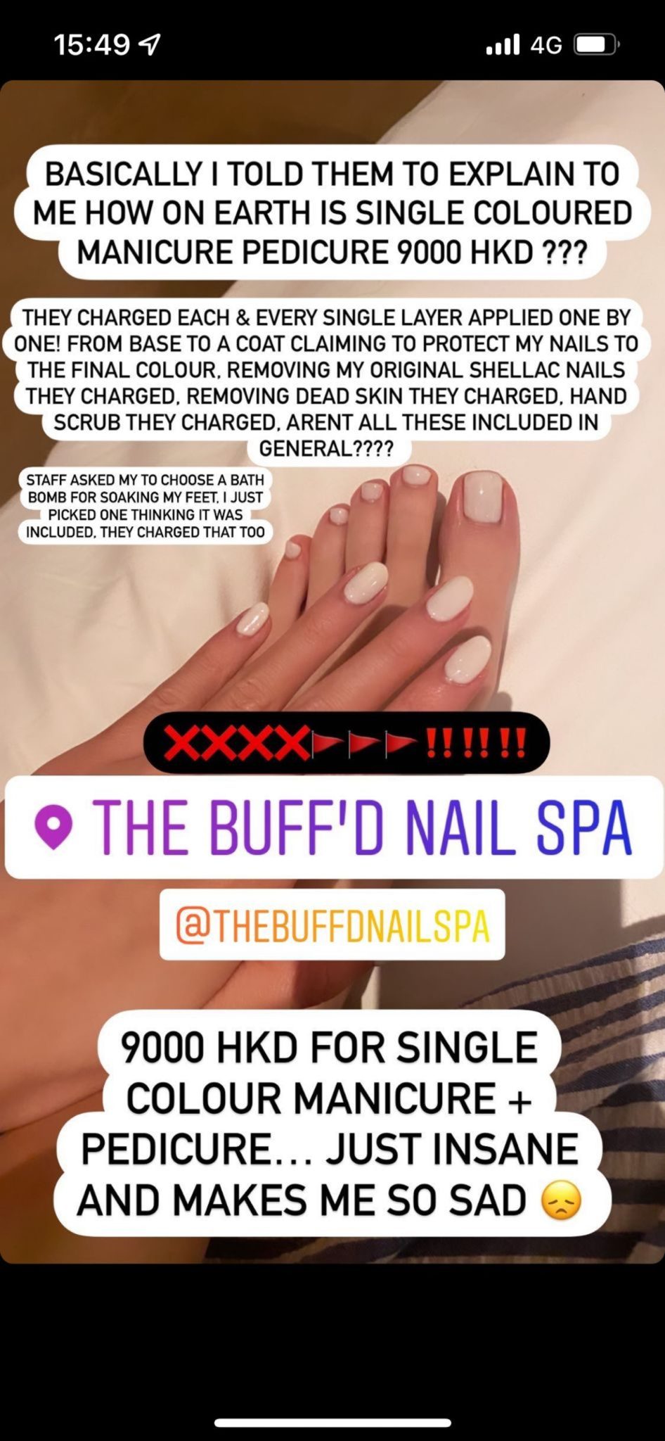 Yuki早前於IG連出3個限時動態,以英文怒罵新加玻THE BUFF’D NAIL SPA,聲稱自己於這間店進行單色美甲、修指甲、修腳甲,結果埋單盛惠港幣$9000。一開始店鋪職員超友善,不斷建議你進行不同項目,但過程中並不會告訴你收費為何,最終自己共進行了15項收費,單色美甲及修腳服務將近花費港幣$9,000元。