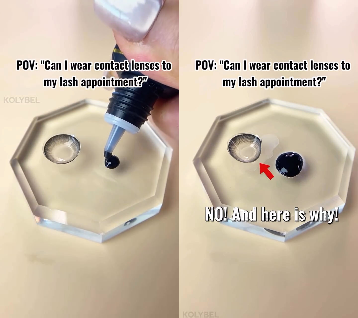 在實驗影片中,將美睫膠水擠在隱形眼鏡附近,本來正常狀態的隱形眼鏡就開始變形、捲曲,亦引申出一個問題:植睫毛時究竟能否佩戴隱形眼鏡。