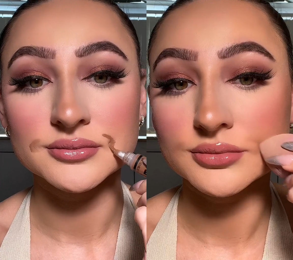 首先,先用比膚色深一度的遮瑕膏或者修容膏,在兩邊的嘴角旁邊畫上刮弧「()」形式,然後用美妝蛋輕輕印開,營造陰影凹坑效果。