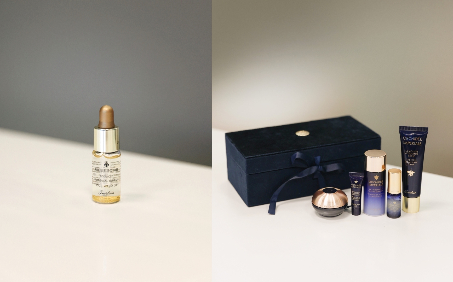左:殿級蜂皇升級版水凝黑蜂活肌蜜5ml;右:御庭蘭花極緻修護禮品
