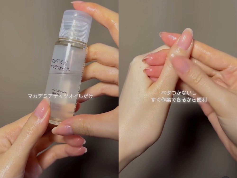 再用夏威夷堅果油塗抹全手,特別是加強按摩指緣、關節位置。