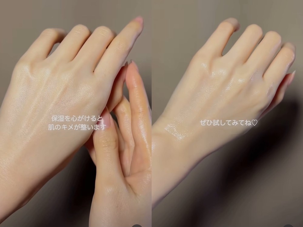 一般日常護手,大家都會首選hand cream,不過這位手模就將雙手當成面部皮膚,用化妝水+護膚油的組合用護手。清潔後先用化妝水塗抹雙手,軟化肌膚。