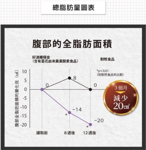 相信各位SIS都想知道到底真人實測Helaslim®「好速纖極金版」的結果如何!臨床測試12週每日攝取2粒,根據研究報告,連續3個月每天食2粒就能減少總脂肪面積 20cm2 ,好速纖極金版不單止減少內臟脂肪,就連皮下脂肪也能燃燒,難怪效果非常顯著~