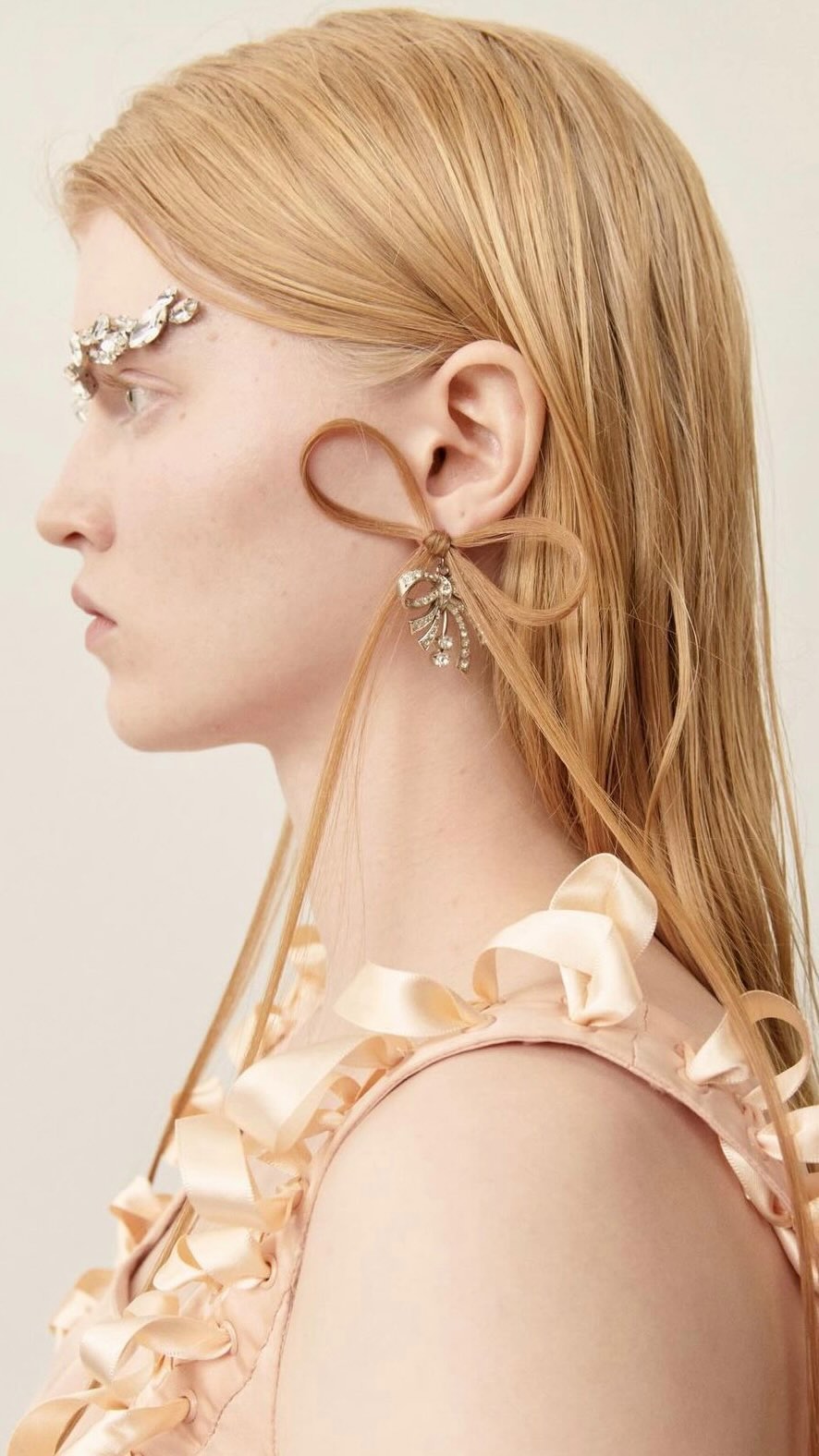 以頭髮為靈感並製作而成的「頭髮耳環」由設計師 Antonin Mongin 操刀,結合了近年最火的 Balletcore 蝴蝶結元素,以另類手法將 Simone 的法式浪漫美學昇華,打造出令人難以忘懷的時尚造型。