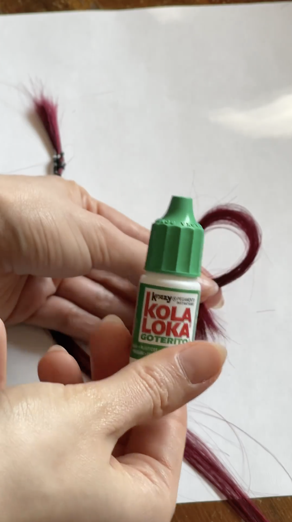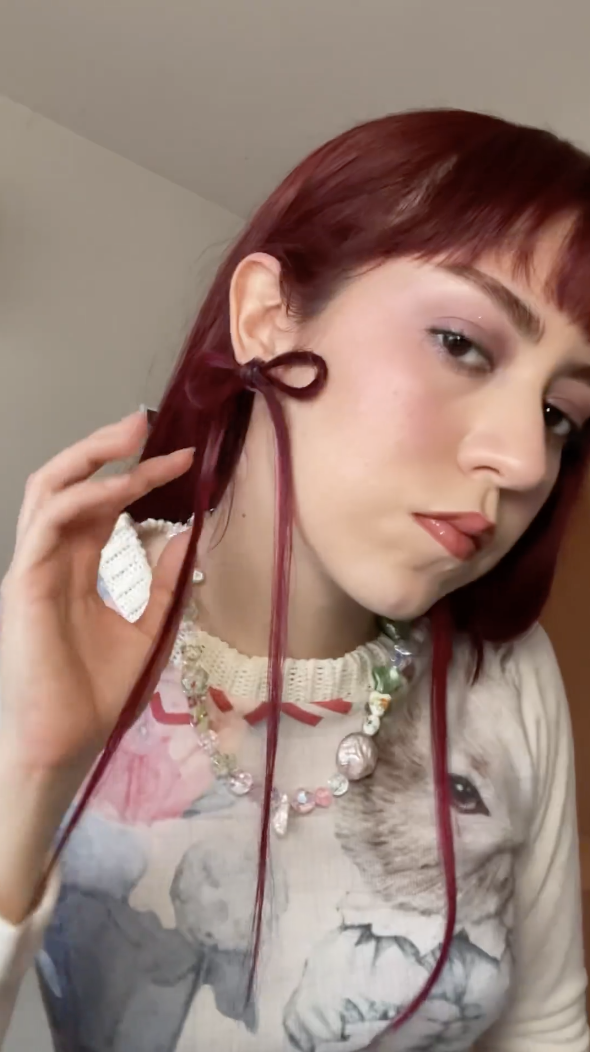 一位名為 Sandra 的外國網紅也相應效法,在社交媒體上還原了這個極具特色的耳飾。影片中可見她剪下了兩束自己的頭髮,先將頭髮打結成蝴蝶結形狀,然後塗上膠水,粘貼上耳環拖,最後成功還原同款「頭髮耳環」。
