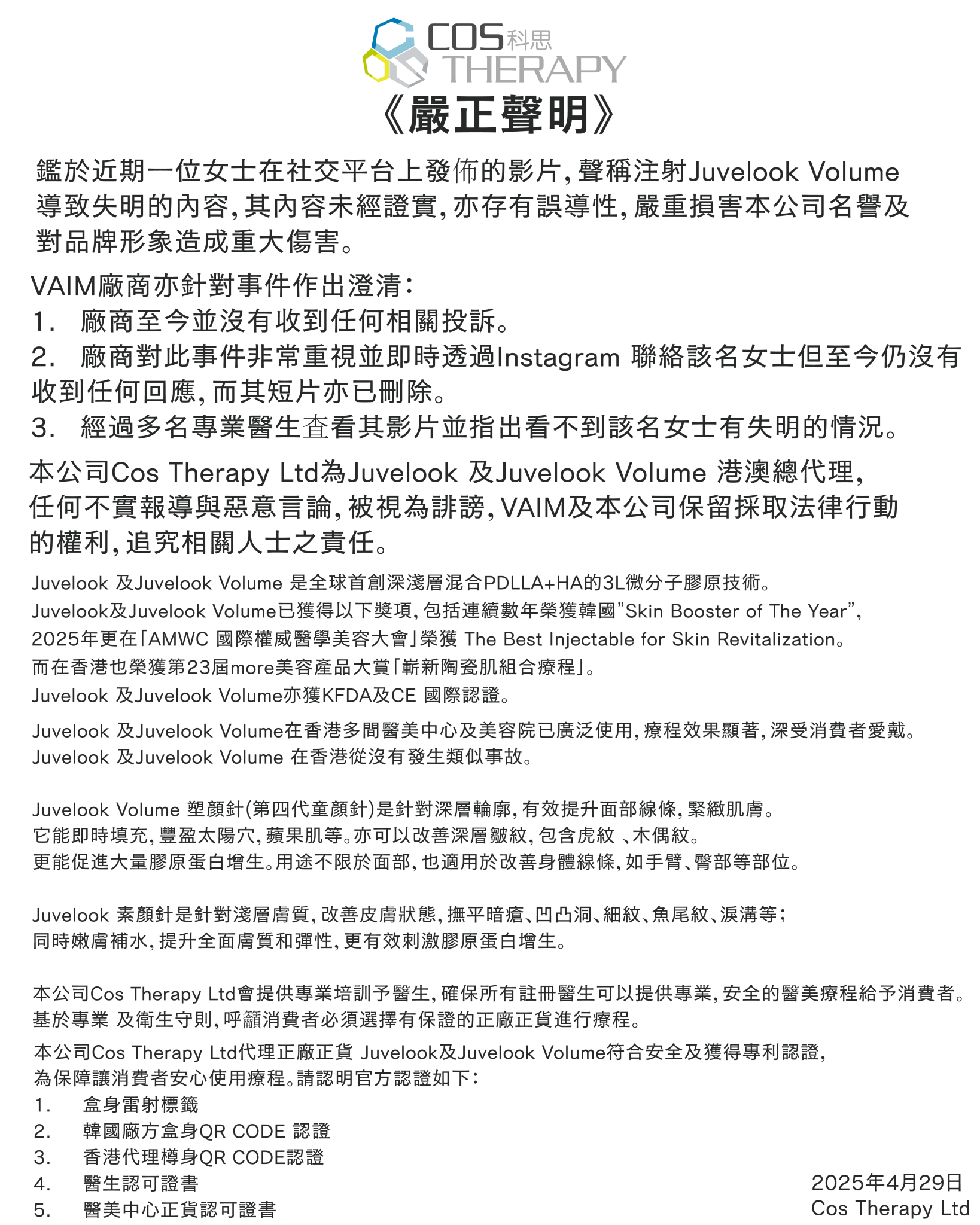 由港澳總代理Cos Therapy Ltd.發怖的《嚴正聲明》全文(2025年4月29日更新版本)