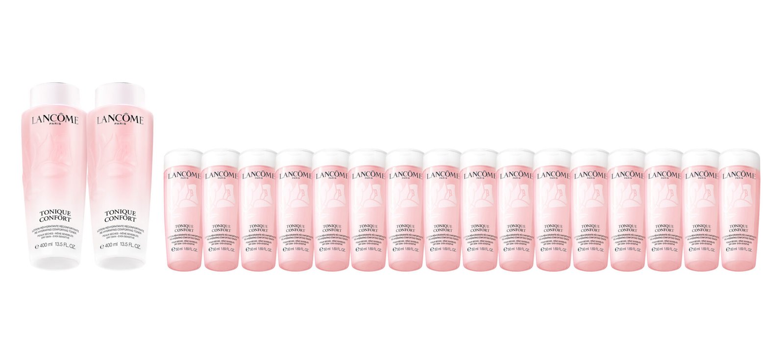 被譽為乾肌救星的「粉水」套裝,一套已包含 2 支 400ml 正裝及多達 16 支 50ml 迷你裝,無論居家豪用還是帶去旅行都非常方便!