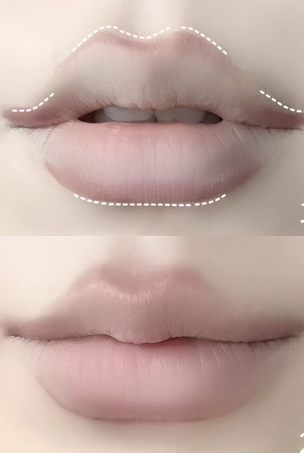 深唇的sis可以先用粉底液輕輕遮蓋原唇色,弱化本身的唇部輪廓。先用用唇線筆在上唇邊緣沿著唇峰畫出兩個倒V,上唇嘴角,和下唇中間也勾勒一下。用唇掃輕輕暈染,稍微過度,令嘴唇有明顯立體度。