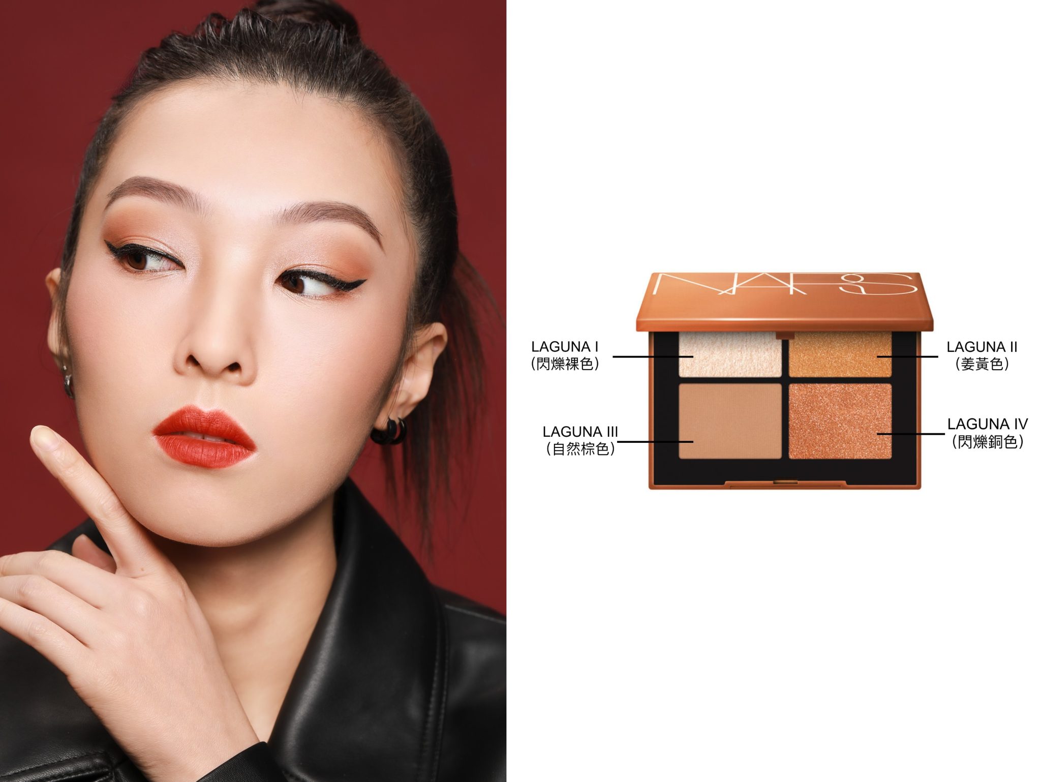 先用LAGUNA四色眼影組合化出眼影,以左下Laguna lll自然棕色及右上Laguna ll姜黃色塗抹在眼窩打底及下眼影眼尾1/3位置,以帶閃粉的Laguna l提亮眼蓋及眼頭,畫上上揚的眼線,打造出深邃而又bling bling的眼神,塗上CLIMAX 睫毛膏拉長眼睫毛,放大眼睛,再利用ORGASM胭脂為妝容增加氣息感。立即入手LAGUNA四色眼影組合:https://bit.ly/3EQE1pc
