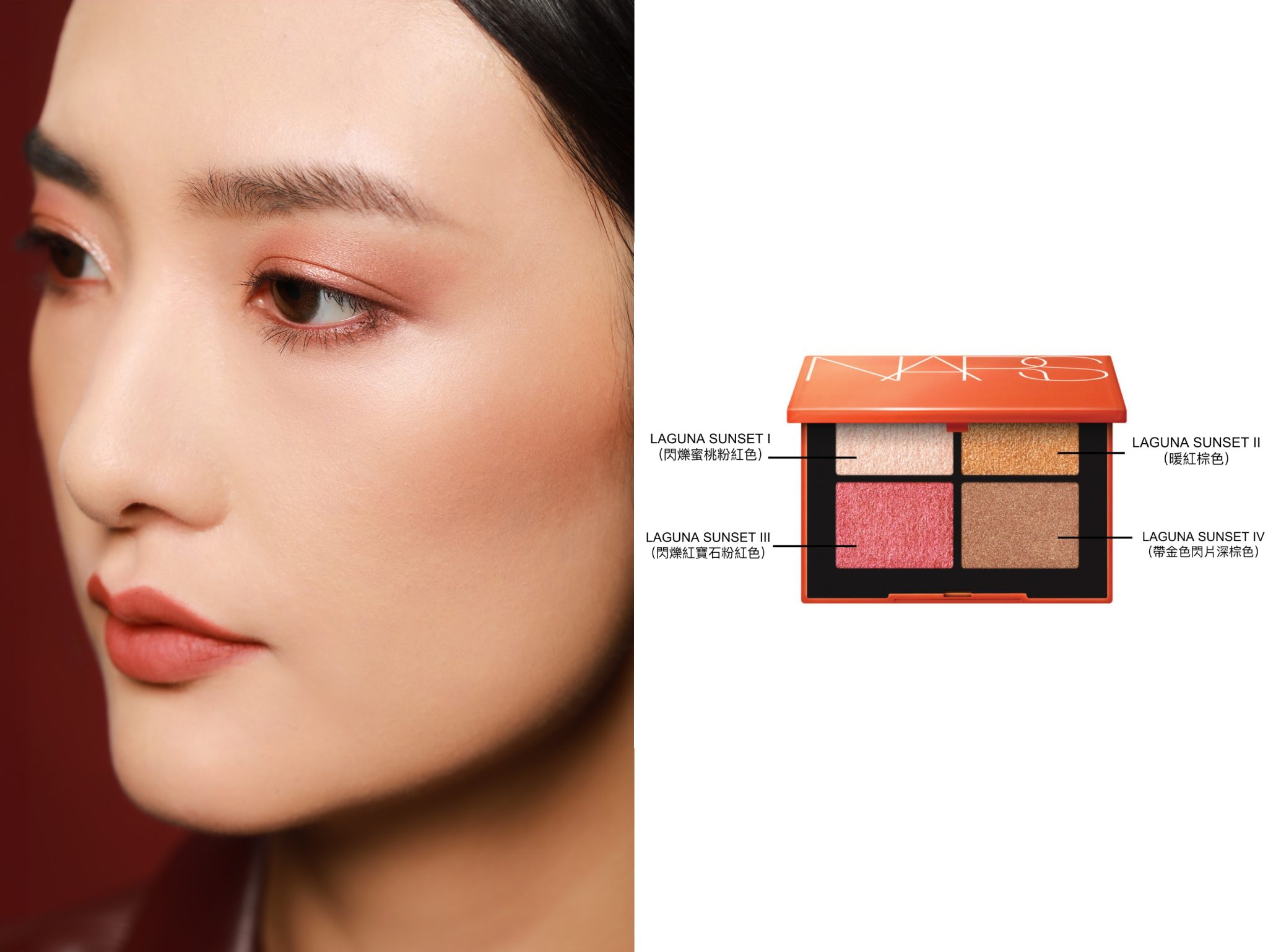 先用柔霧完美遮瑕膏在眼窩打底,令眼皮望落更乾淨,同時令眼影更顯色。在眼窩孤型處以持久顯色眼線筆打底,以Laguna Sunset四色眼影組合的Laguna Sunset IV帶金色閃片深棕色在眼窩處加深,Laguna Sunset II暖紅棕色覆蓋整個眼蓋,配合Laguna Sunset I閃爍蜜桃粉紅色提亮眼頭,最後用持久顯色眼線筆 #Mambo畫上内眼線及塗上CLIMAX 睫毛膏就完成眼妝部分。想整張臉都顯得更精緻,小編會以LAGUNA古銅粉輕掃在顴骨、下顎線的位置,讓輪廓更加立體。立即入手:Laguna Sunset四色眼影組合https://bit.ly/3EVihIK