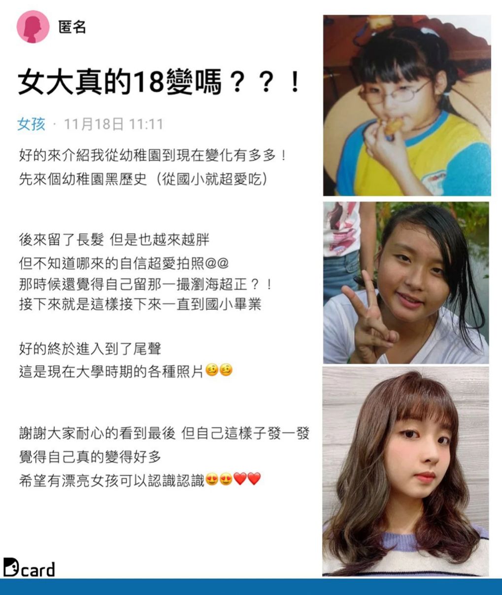 從照片可見台灣女生由幼稚園至大學的蛻變過程,POST主表示自己從小超愛吃,所以幼稚園和小學時期比較胖,而且小時候沒有防曬概念,經常到處遊玩,所以皮膚黝黑。幼稚園更不時出現奇怪造型,留下一堆黑歷史照片。