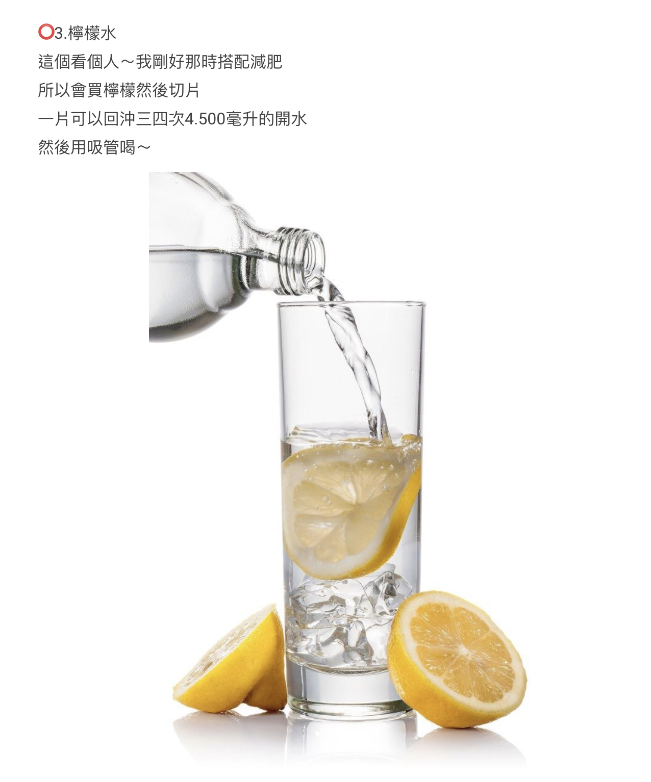 由於樓主美白與減肥同時進行,所以有飲用檸檬水習慣。將檸檬切片再回沖3至4次約500毫升的溫水。
