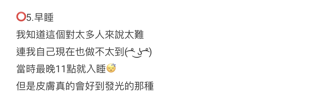 這點相信對都市人來說最難做到,約晚上11時上床睡覺,早睡其實是令皮膚變好的最有效方法。編輯也親身經歷過堅持晚上11點睡覺,當時滿臉青春痘全部消失,皮膚的確變好,但太難維持早睡的習慣,一段時間後就放棄了。