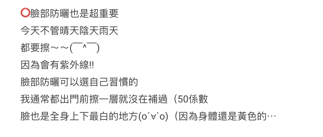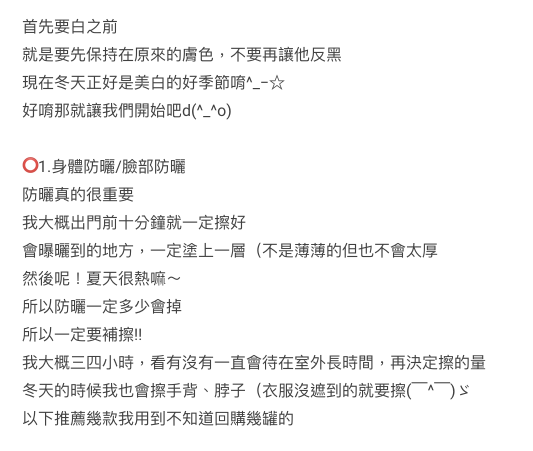 樓主指出防曬真的很重要,美白的第一步就是先保持原本的膚色,不要再變黑!出門前十分鐘就會擦好防曬,會曬到的地方就會塗上防曬,份量不厚也不薄,夏天每隔3-4小時就會補充一次防曬,冬天更會連手背、脖子、衣服沒遮到的地方都會塗。