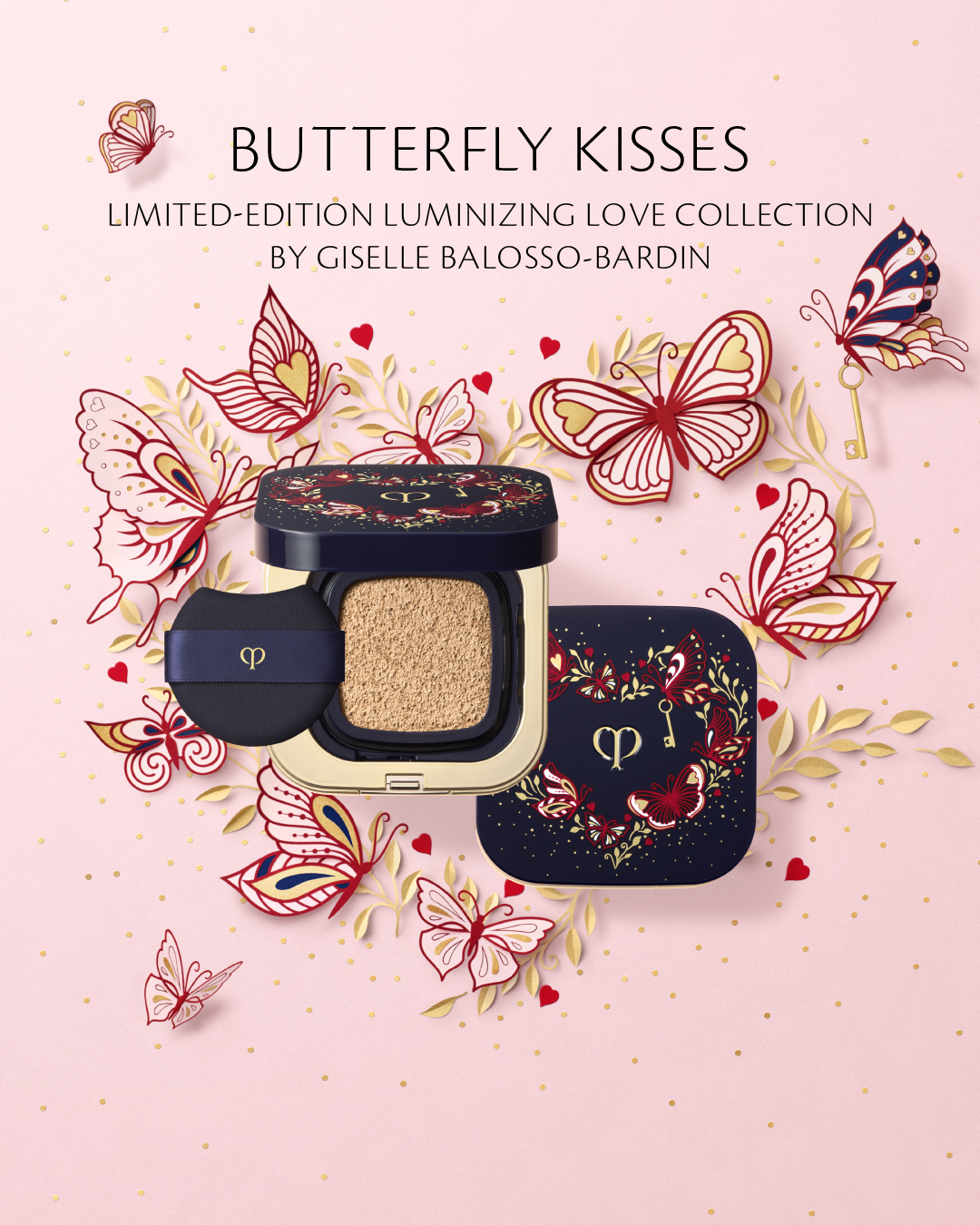 Clé de Peau Beauté 首度與法國著名藝術家 Giselle Balosso-Bardin 合作,換上蝴蝶為主題的情人節珍藏版外殻,非常值得收藏!氣墊粉底中蘊含獨家護膚成分—智能亮肌精華,多層塗抹依然保持輕盈無瑕感,高效保濕鎖水功效同時有效持久控油,預防脫妝。