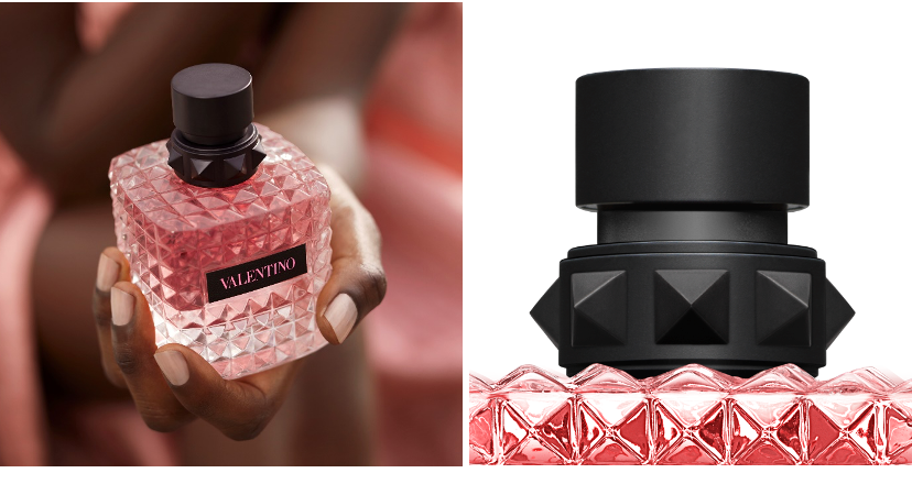 Born in Roma 香水靈感來自 Valentino 高訂時裝,瓶身佈滿經典鉚釘元素,就連頸環細節位亦套上「 鉚釘頸鍊 」,香水由透明玻璃瓶內節射,正面印有 Valentino 名牌,設計簡約時尚!