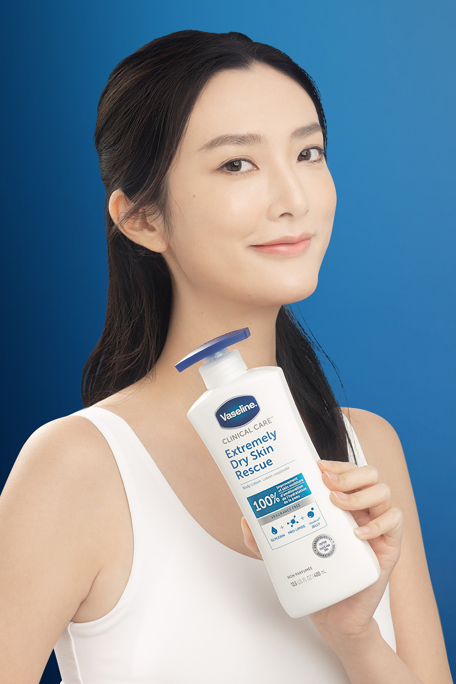 ^100% 皮膚潤澤指聯合利華委托第三方機構(加拿大,2013): 20 名受試者使用產品的 2、4、6、24 小時後,與未使用部位相比,下列三項保濕測試參數均有顯著改善:肌膚導電度含水量評估、角質電容含水量評估與視覺乾燥評估。• 無香低敏配方,經皮膚科專家測試。