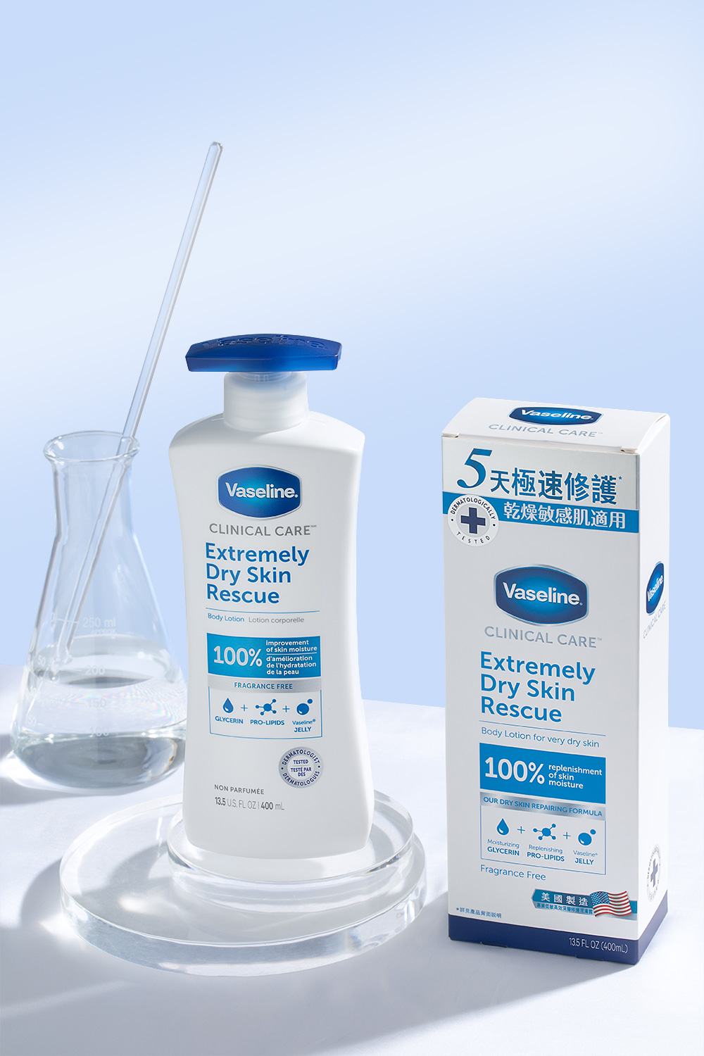 ⁺⁺聯合利華委託第三方機構 (美國,2018): 39 名受試者使用產品兩周後之問卷調查結果。 87% 認同改善肌膚乾癢; 74%認同肌膚狀態改善。需每天使用兩次。*聯合利華委托第三方機構( 加拿大,2013 ): 36名受試者連續使用產品五天後之視覺乾燥改善程度與未使用之部位相比。