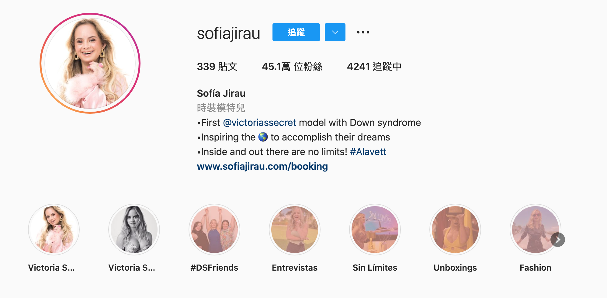 24歲 Sofía Jirau 在2020年正式於紐約時裝周出道,今年首次獲邀成Victoria’s Secret 模特兒,出鏡全新的Love Cloud系列,希望以此推廣擁抱所有女性的概念。 Sofía Jirau 更鼓勵其他唐氏綜合症的人不要為自己設限,勇敢面對世界,建立自己的生活、事業,努力過好每一天,擁抱自己的美好。