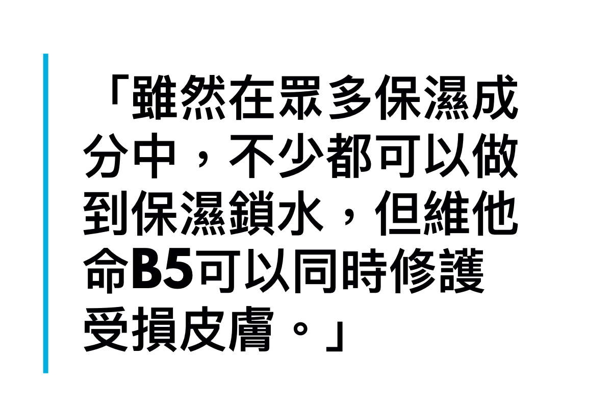 原來維他命B5不但可以深層保濕,達到緩解刺激症狀,更是有效的皮膚修復成份,像是以繃帶包住肌膚一樣,加強防禦力之餘同時也促進受損肌膚癒合,而維他命B5的最佳濃度則為5-10%,皮膚更容易接受,對於加速肌膚屏障修復力有莫大幫助!