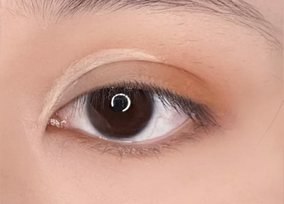 利用米白色眼影或遮瑕膏,在眼頭雙眼皮摺上塗抹,然後輕輕暈染,暈染的位置大約去到眼睛中央,將淺色眼頭和深色眼尾自然過渡。