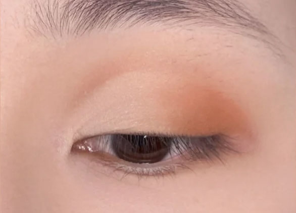 先用主色塗抹在眼尾位置,輕輕向前暈染。然後換上一支小號或扁頭化妝掃,沾取同一隻顏色,在眼頭雙眼皮摺稍為對上的位置,畫上一條和雙眼皮平行的弧線。