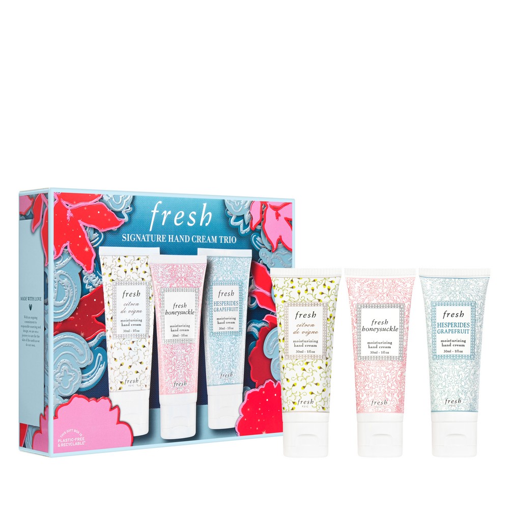 冬天最怕雙手乾燥!fresh 精選潤手霜三重奏中包括3種香味的hand cream:香檳葡萄、忍冬花以及西柚果香,讓雙手保持柔軟。