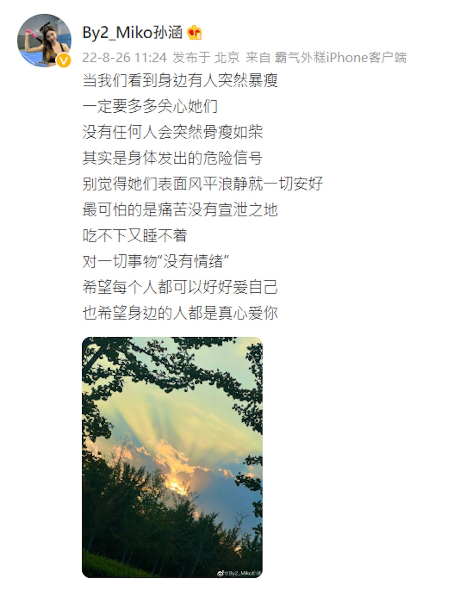台灣雙胞胎組合 BY2 成員 Yumi 去年曾捲入王力宏婚變風波,期間遭正室李靚蕾映射 Yumi 是王力宏的「炮友」。最近姊妹 Miko 在微博發文,指如果發現身邊的人突然暴瘦,一定要多多關心他們,這是身體發出的警告。