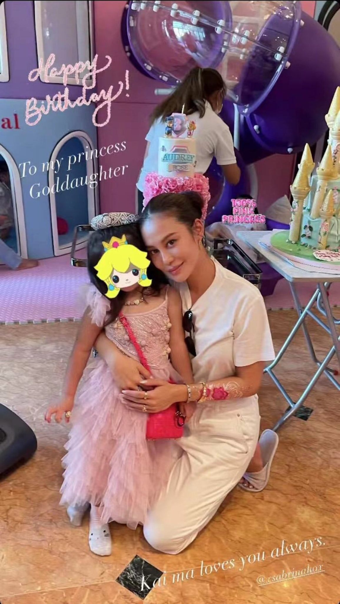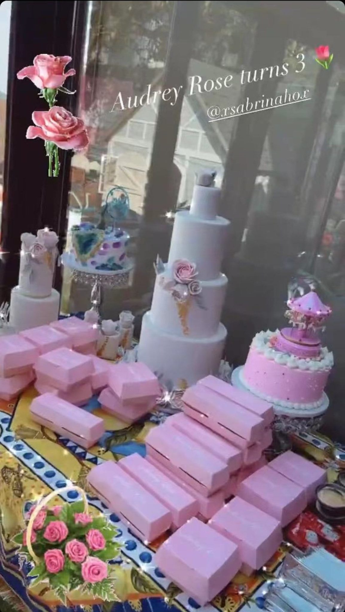 林心兒除了發佈契女孭著名牌手袋的限時動態,亦有公開生日派對的裝飾品,例如印有 Audrey 名字的粉紅色餐盒,粉紅色蛋糕等等~感覺很少女心!有城堡又有粉紅色,的確是每個小朋友夢想的生日會!